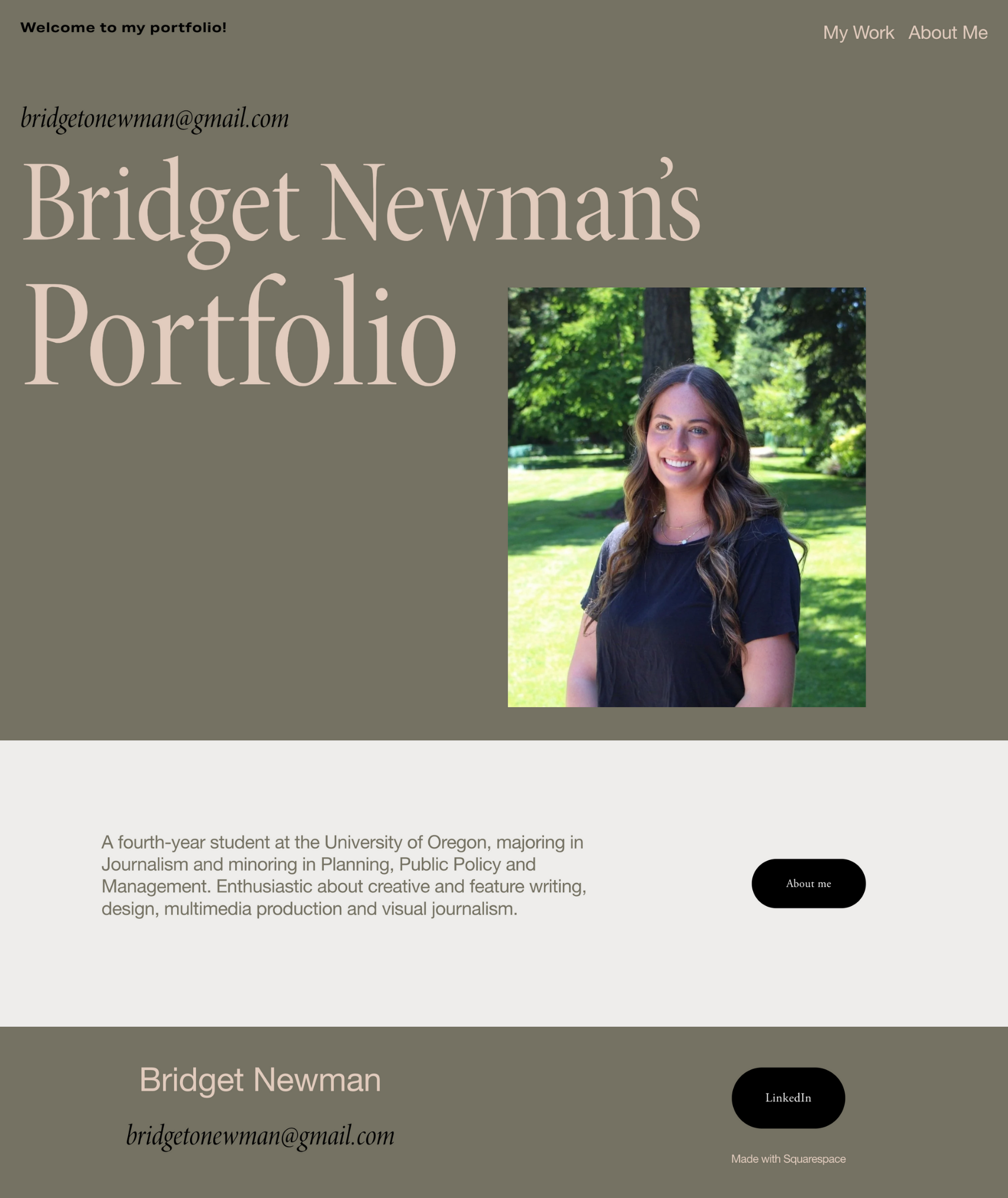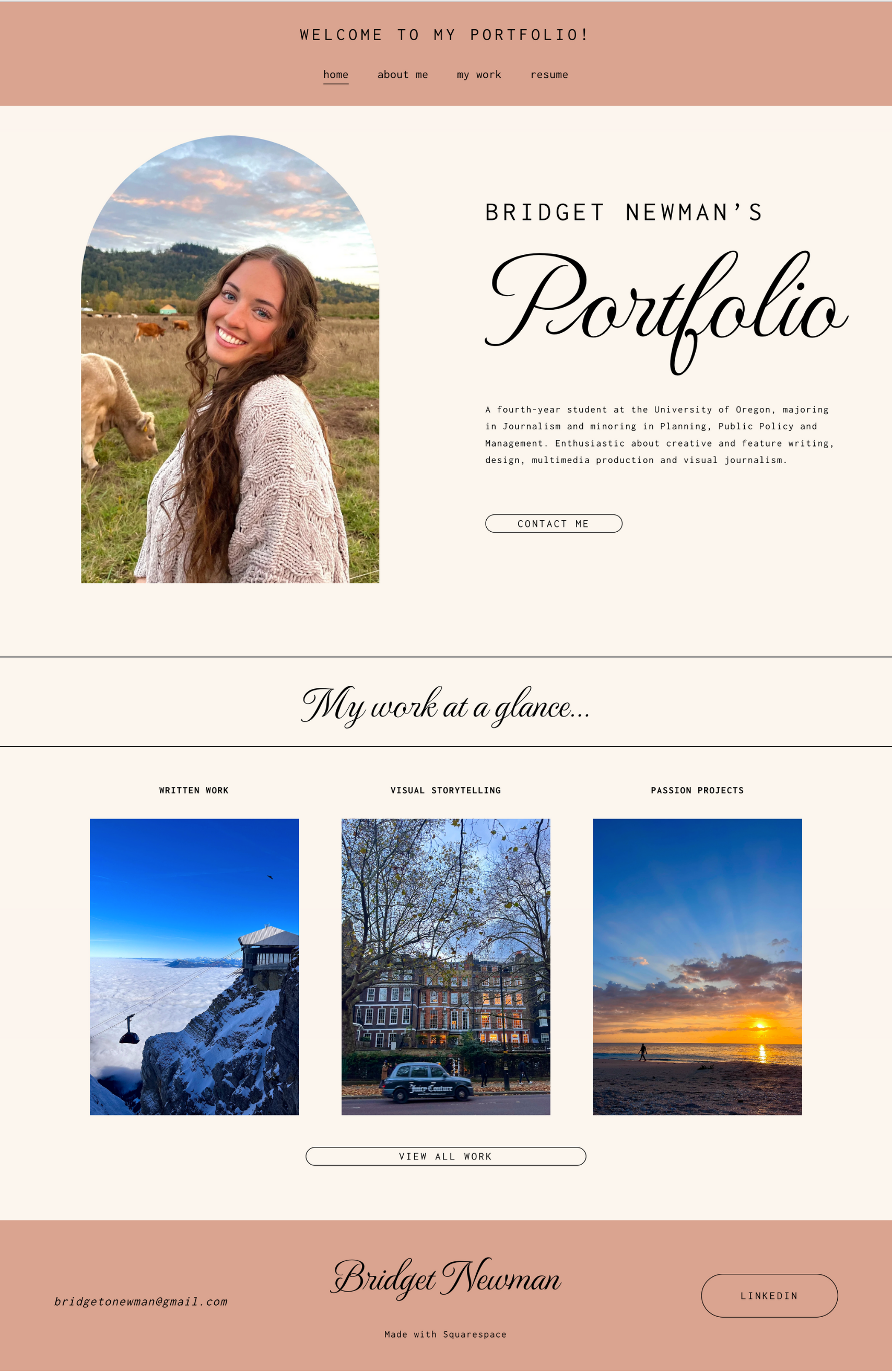 Bridget Newman is a fourth-year student at the University of Oregon, majoring in Journalism and minoring in Planning, Public Policy and Management. She needed a website that appropriately reflected her passion for creative and feature writing, design, multimedia production and visual journalism. Although functional, her self-built website was no longer cutting it. She needed something more polished, easy to follow, and indicative of her personality. Over the course of just 24 hours, we were able to work together and revamp her entire website to better fit her needs.